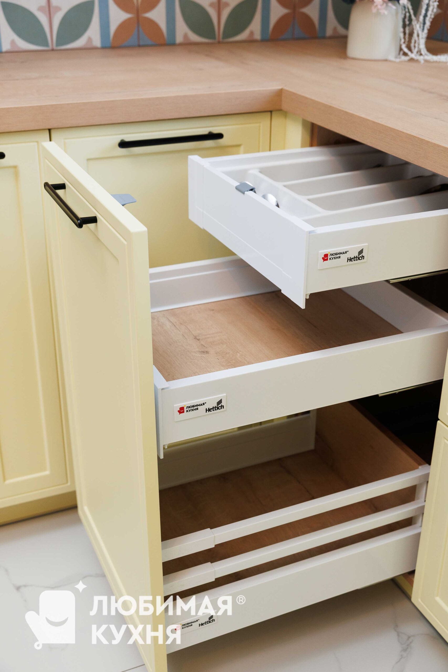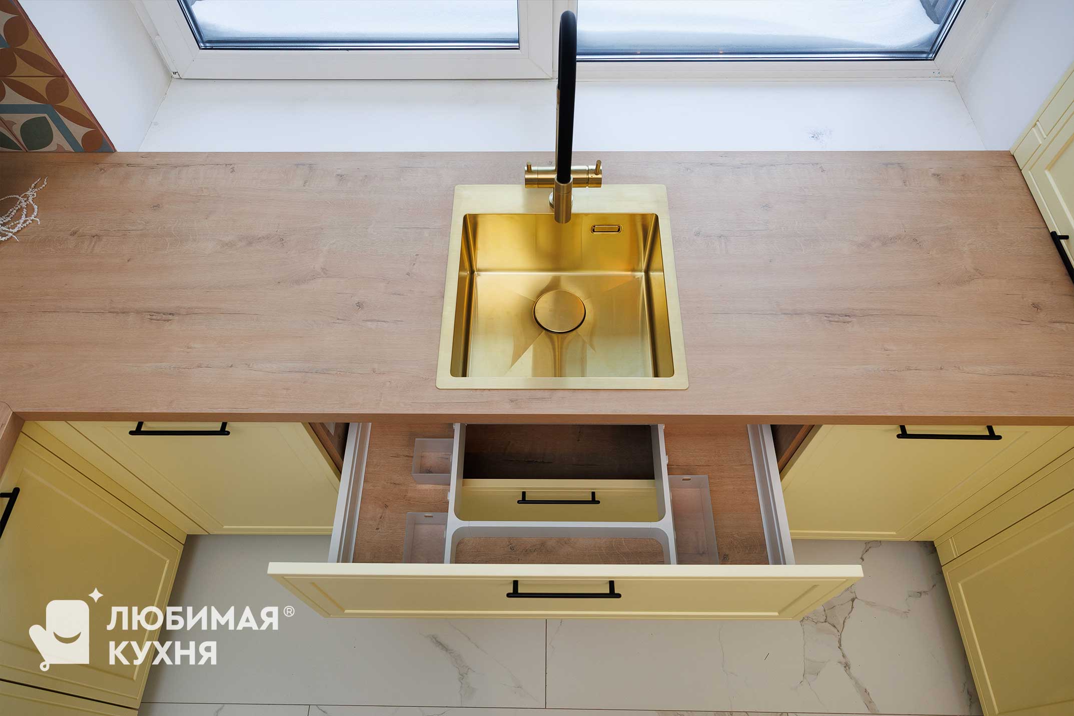 Уютная кухня в скандинавском стиле с фасадами нежно-лимонного оттенка. Фартук из цементной плитки с геометрическим орнаментом в терракотовых и оливковых тонах добавляет характер пространству. Функциональный остров из ЛДСП с текстурой дуба со встроенной розеткой служит обеденной зоной. Очень милая кухня, которая прекрасно впишется в интерьер квартиры и загородного дома.