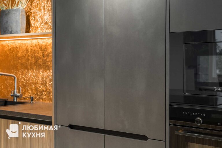 Шикарная кухня для ценителей сложных текстур, цветовых сочетаний и внимательных к деталям. Небольшая зона с мойкой, совмещенная с невероятно вместительными пеналами, в которых разместились полки для хранения различной утвари, от кофемашины, до столовых приборов и колонны со встроенной техникой. Композицию завершает большой и вместительный остров, с одной стороны которого предусмотрена зона готовки с варочной панелью, а с другой зона приема пищи и отдыха.