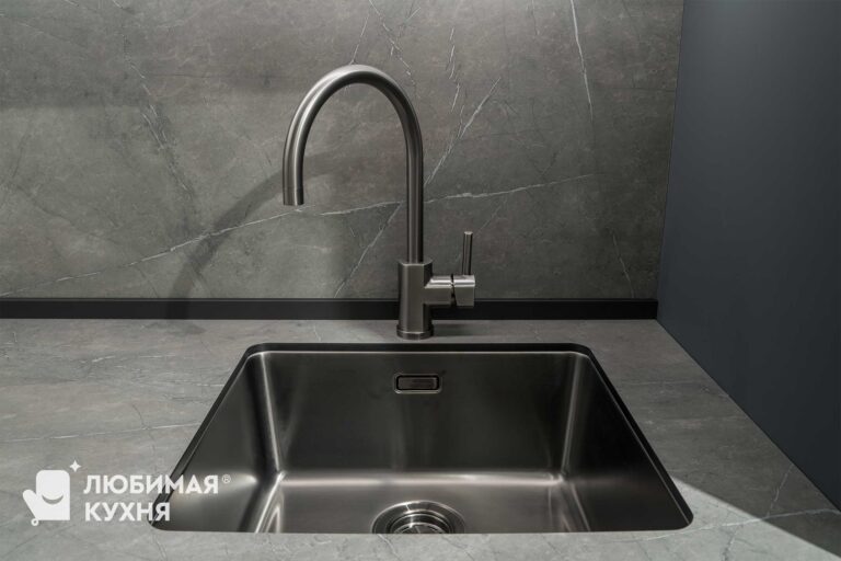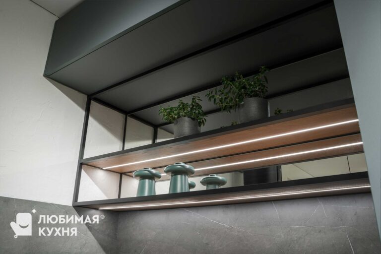 Сдержанная и минималистичная кухня прекрасно впишется как в квартиру, так и в домик за городом. Для данной модели подобраны только самые практичные материалы — фасады кухни облицованы пластиком, который невероятно прост в уходе и способен выдерживать влагу и загрязнения. Верх кухни облегченный — полки из металлического профиля сохраняют функциональность и сохраняют воздушность. А так же в кухне предусмотрены пенал для встроенного холодильника и интегрированный обеденный стол, что очень удобно для пространств с ограниченной площадью.
