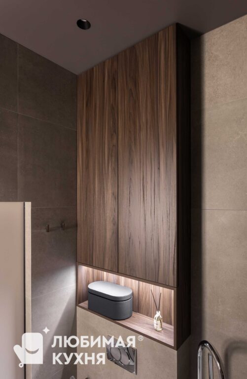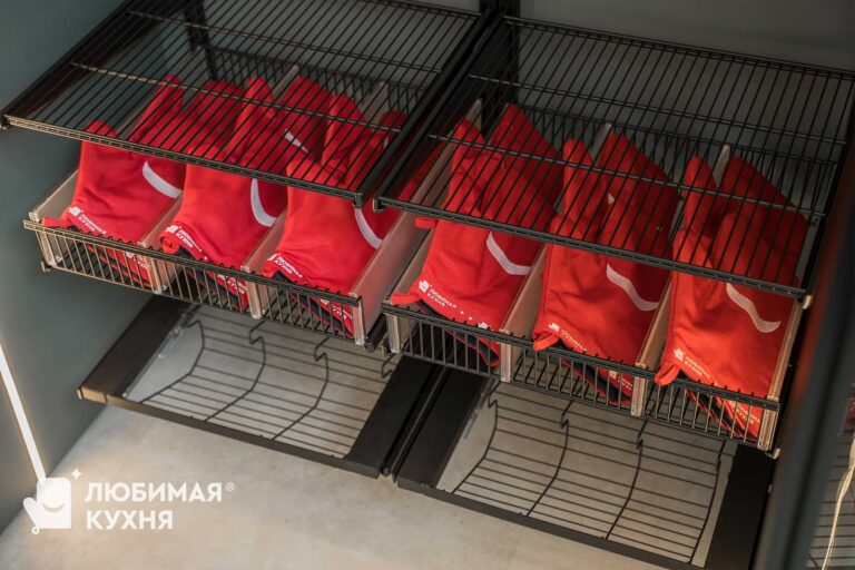 Стильная гардеробная, невероятно вместительная и продуманная до мелочей. В полках предусмотрена подсветка, для отличного обзора вещей даже без основного освещения. Системы хранения — полки,ящики,сетки, все продумано для комфортного расположения различных вещей вашего гардероба.