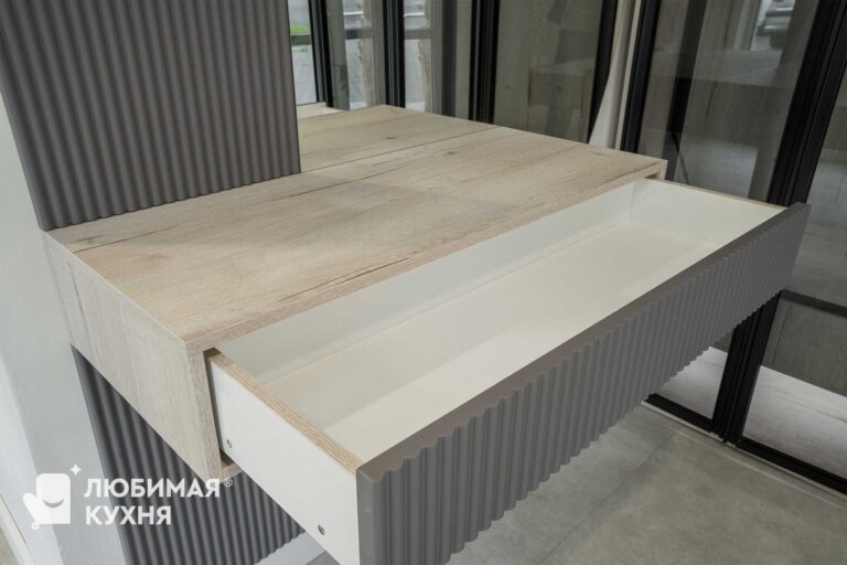 Комплект мебели в прихожую — подвесная тумба с зеркалом, стеновыми панелями и воздушным шкафом. Шкаф продуман для размещения верхней одежды на плечиках, а так же оборудован выдвижными ящиками. Подсветка обеспечивает отличный обзор всего содержимого, в таком шкафу вы не потеряете ни одну вещицу!