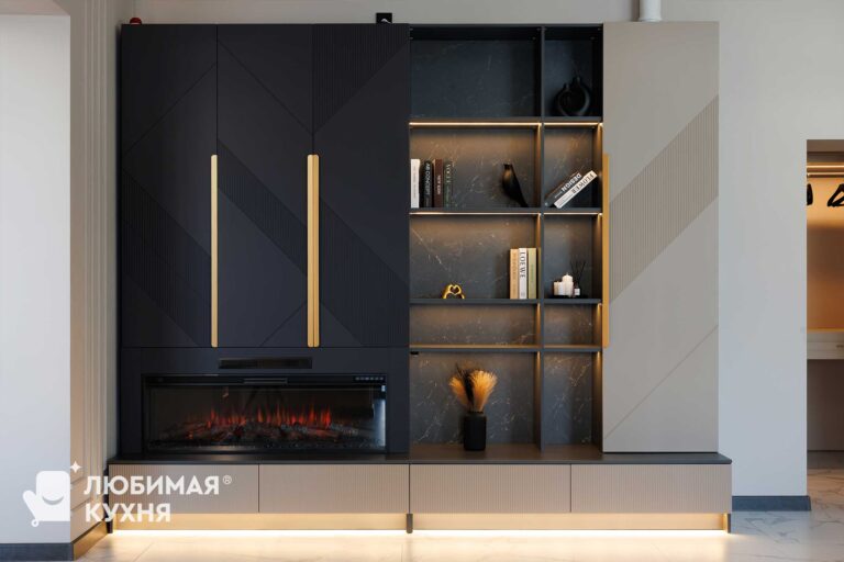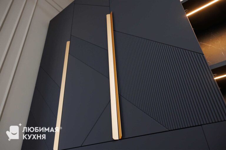 Двери: фасады шкафа ТРП Софт коф, фреза Макондо, фреза Маркез, полки серия Eterno, цвет ETM20 Matt Nevada, стол ЛДСП Галифакс табак