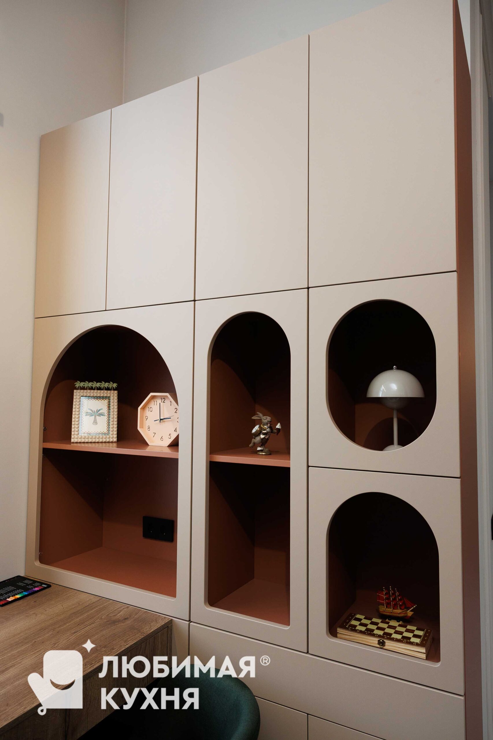 Креативная мебель для детской в мягком бежевом оттенке с игривыми нишами терракотового цвета. Шкаф сочетает закрытые шкафы и открытые полки необычных форм — для хранения игрушек, книг и декора. Стол с деревянной столешницей создают уютную зону для занятий. Функциональное решение, которое стимулирует воображение ребёнка и органично вписывается в современный интерьер.
